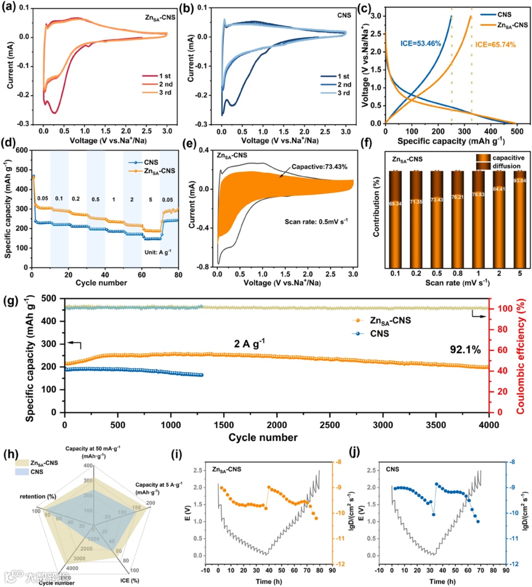 (a)ZnSA-CNS和(b)CNS电极在0.1 mV s-1扫描速率下的CV曲线。(c)所有样品在50 mA g−1下的恒电流充电/放电曲线。(d)评估所有样品在不同电流密度下的性能。(e)在0.5 mV s-1的扫描速率下和(f)在不同扫描速率下的电容过程贡献比。(g)所有样品在2.0 A g−1下的长期循环性能。(h)ZnSA-CNS和CNS的综合性能比较。(i)ZnSA-CNS和(j)CNS在不同嵌钠和脱钠状态下的相应DNa+值。