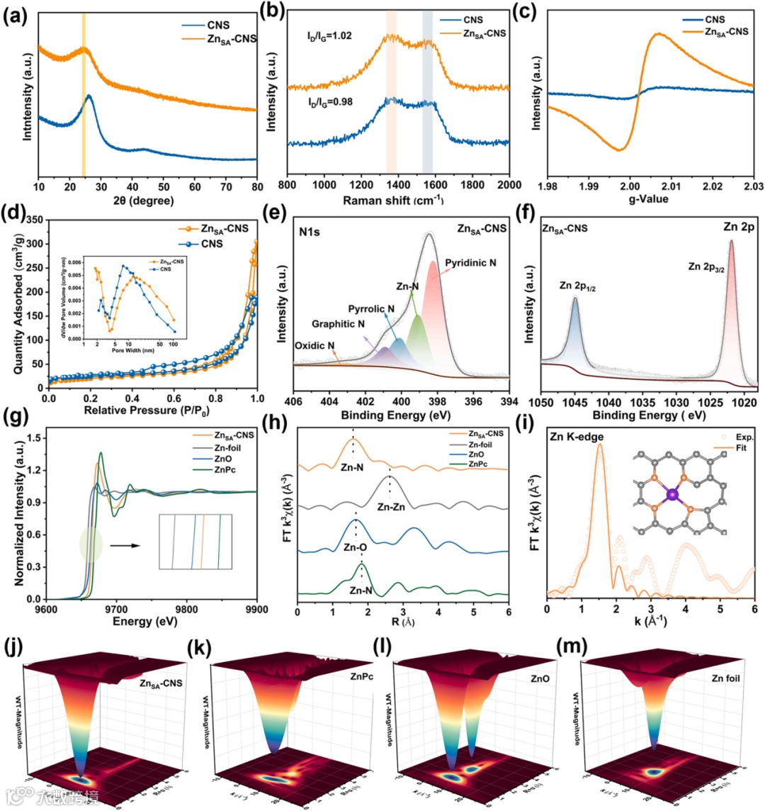 (a)XRD图谱,(b)拉曼光谱,(c)CNS和ZnSA-CNS的EPR光谱。(d)N2吸附/解吸等温线和ZnSA-CNS和CNS的相应孔径分布。(e)N 1s和(f)Zn 2p的高分辨率XPS光谱。(g)ZnSA-CNS和参考样品的Zn K边XANES光谱和(h)FT-EXAFS光谱。(i)ZnSA-CNS的EXAFS拟合曲线;插图是ZnSA-CNS的示意图模型。(j–m)样品的小波变换图。