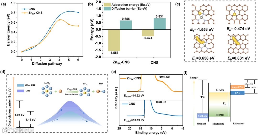 (a)ZnSA-CNS和CNS的扩散能比较。(b)ZnSA-CNS和CNS的Ea和Eb。(c)具有相应吸附能和扩散势垒的优化结构。(d)NaPF6在ZnSA-CNS和CNS电极上的解离能垒。(e)ZnSA-CNS和CNS由UPS确定的功函数值。(f)说明ZnSA-CNS和CNS表面电解质还原能的示意图。