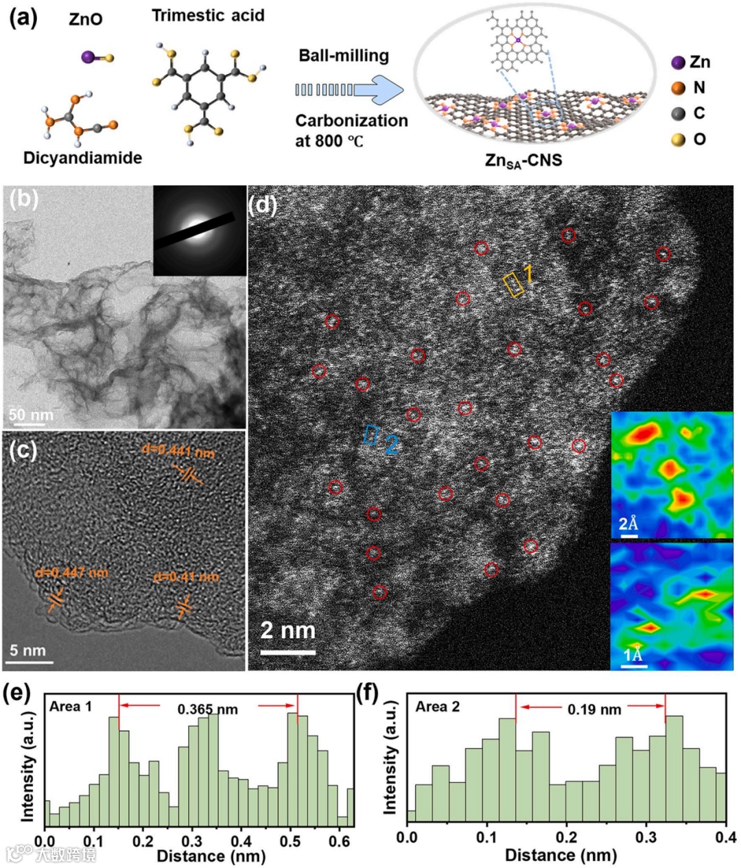 (a)ZnSA-CNS的合成过程示意图。(b,c)不同放大倍数下ZnSA-CNS的TEM图像,(b)中的插图显示了相应的SAED图像。(d)原子水平上ZnSA-CNS的HAADF-STEM图像,插图显示了区域1和2中原子距离的高斯拟合模式。(e,f)如(d)所示的区域1和2的强度分布。