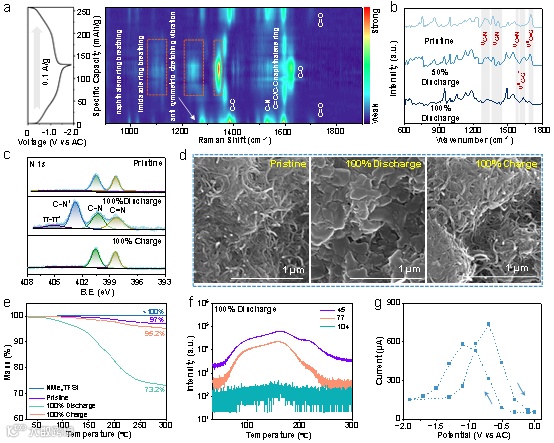 图5. BBL@CNTs电极的储能机理。a)充放电循环中原位Raman光谱的强度映射图。b)FT-IR光谱。c)N 1s XPS谱。d)SEM图像。e)NM4TFSI和不同状态下BBL@CNTs的TG结果。f)100%放电状态BBL@CNTs的TG-MS结果。g)BBL@CNTs的原位直流测试。