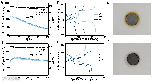 图3. 循环稳定性测试和100次循环后的数码照片。a-c)PTCDA;d-f)PTCDI。