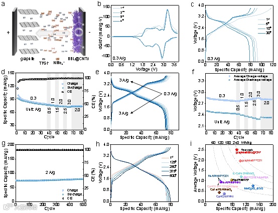 图8. 石墨//BBL@CNTs DIB的电化学性能(BBL:1.3 mg/cm2)。a)DIB示意图。b)dQ/dV曲线。c)0.3 A/g下不同循环的GCD曲线。d)倍率性能和e)不同电流密度下相应的GCD曲线。f)倍率性能测试中的平均电压。g)2 A/g下的长循环性能和h)不同循环下的GCD曲线。i)与其他文献的比较。