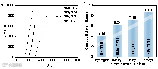 图2. 不同铵盐电解液(1M)的电导率对比。a)原始EIS谱;b)离子电导率。