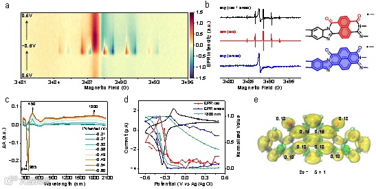 图6. BBL的原位EPR/UV-vis-NIR光谱研究。a)BBL在不同状态下的原位EPR光谱的强度映射图。b)各向同性和各向异性EPR信号的实验和模拟结果。c)在还原CV扫描期间测量的BBL的原位UV-vis-NIR光谱。d)各向同性和各向异性EPR信号强度与1800 nm吸收强度的电势相关性。e)简化BBL模型的双阴离子自旋电子布居。