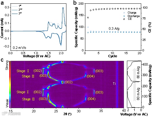 图7. TFSI-嵌入石墨正极。a)CV曲线和b)石墨正极在半电池中的循环性能。c)两次充放电循环中原位XRD的强度映射图。