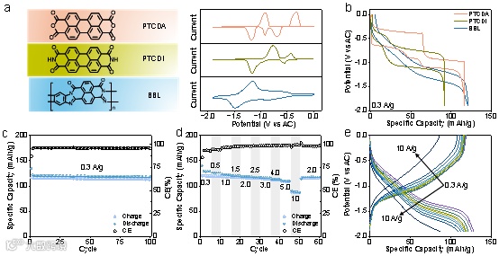 图4. BBL@CNTs在NMe4TFSI电解液中的电化学表现。a)PTCDA、PTCDI和BBL(顺式构型)的化学结构及其在0.2 mV/s下的CV曲线。b)PTCDA、PTCDI和BBL@CNTs在0.3A/g下的充放电曲线(第二次循环)。c)BBL@CNTs在0.3 A/g下的长循环性能。d)BBL@CNTs的倍率性能以及e)相应的充放电曲线。
