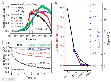 研究了四种不同晶相MnOx催化剂结构、中间物种动力学与OER性能之间的关系。由于Mn3+常被视为OER的活性位点,因此将四个样品中Mn3+的含量与OER活性进行对比,发现OER活性和Mn3+含量之间并不存在较好的一致性关系,这表明Mn3+的含量不是决定OER活性的本质因素(图4)。利用EC-TA光谱从动力学方面研究催化剂的结构对OER性能影响的本质因素,发现短电位脉冲宽度下获得的*OH物种形成速率(图5a)和长电位脉冲宽度下获得的水氧化决速步(RDS)的速率(图5b)及水氧化的活性变化规律显示出良好的正相关性(图5c),表明OER中间物种转化动力学在OER活性中的决定性作用。