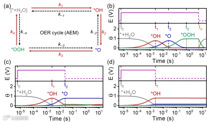 图1 (a)OER循环示意图。不同电位脉冲宽度下OER中间物种覆盖度(θ)随时间(t)演化的微观动力学模拟:(b)5 s电位脉冲宽度;(c)25 ms电位脉冲宽度;(d)2.5 ms电位脉冲宽度。