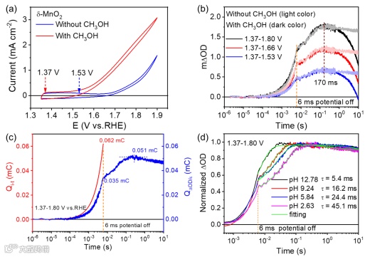 图 3 (a)在有/无CH3OH电解液中,δ-MnO2的循环伏安曲线;(b)在6 ms电位脉冲宽度下,δ-MnO2在不同高电位下的EC-TA光谱曲线;(c)电子提取量和*OH物种累积量随施加电位时间的变化关系;(d)不同pH下*OH物种形成速率对比。