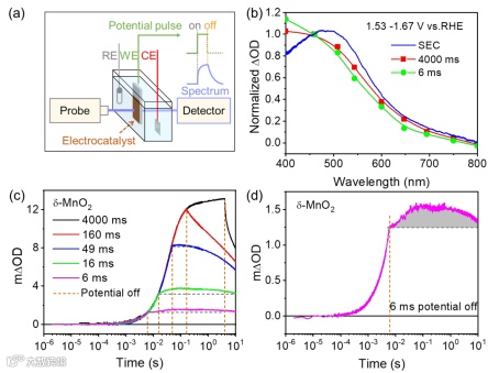 利用自主研发的EC-TA光谱(图2a-c),实现了电位脉冲条件下中间物种的时间分辨检测。逐步减小施加的电位脉冲宽度(图2c),可对中间物种的形成、转化动力学进行直接跟踪探测,发现在电位脉冲宽度小于100 ms量级时,偏压中断后出现了一个瞬态吸收信号的持续积累过程(图2d),可能源于OER第一步中间物种*OH物种的积累。