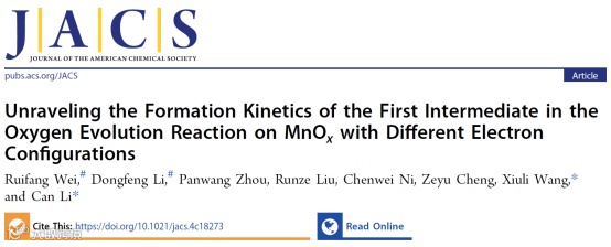 近日,中国科学技术大学&中国科学院大连化学物理研究所李灿院士、王秀丽研究员,在国际知名期刊Journal of the American Chemical Society(JACS)上发表题为“Unraveling the Formation Kinetics of the First Intermediate in the Oxygen Evolution Reaction on MnOx with Different Electron Configurations”的文章。该文章利用自主研发的微秒时间分辨的工况电化学瞬态吸收(EC-TA)光谱技术,研究了典型MnOx基电催化剂(α-Mn2O3、γ-MnO2、δ-MnO2和α-MnO2)上催化OER过程中第一个中间物种(*OH)的形成动力学机制,揭示出*OH物种形成过程中非同步的电子-质子转移动力学过程。