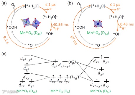 图6 含有D4h对称性(a)和D3d对称性(b)的共顶点的Mn3+O6八面体活性中心的OER动力学循环机制示意图。(c)不同对称性MnO6八面体的能级分裂图。