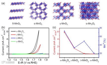 图4 (a)δ-MnO2,α-MnO2,γ-MnO2和α-Mn2O3的晶体结构;(b)四个MnOx催化剂ECSA归一化的循环伏安法曲线;(c)四种MnOx催化剂的OER活性与定量的Mn3+含量对比图。