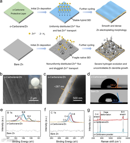 图一系统展示了邻碳硼烷人工界面层的成功构建与基础物化特性。 通过示意图与宏观照片可见,借助简单的溶液浸泡法,邻碳硼烷分子能通过静电作用自发吸附于锌金属表面,形成均匀覆盖的乳白色保护层。扫描电镜图像显示改性后电极表面更为平整致密,截面分析测得该保护层厚度约287 nm且结构均匀。接触角测试证实其疏水性强,能有效阻隔水分子的渗透。X射线光电子能谱和拉曼光谱进一步检测到B-C、B-H等特征化学键信号,从成分上确认了邻碳硼烷分子的成功锚定。