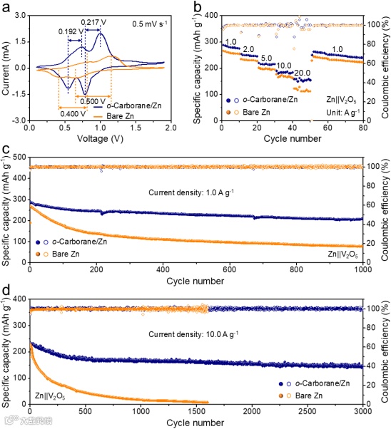 图五则在全电池层面验证了邻碳硼烷改性锌负极的实际应用价值。 当与V2O5正极组裝成全电池后,改性电池的循环伏安曲线显示出更小的电压极化和更高的反应可逆性。在不同电流密度下的倍率性能测试中,改性电池始终展现出比对照组更高的比容量,尤其在20 A g-1的超高倍率下仍能保持154.4 mAh g-1的可逆容量,且电压极化显著减小。更重要的是,在10 A g-1的大电流下经过3000次循环后,改性电池仍能保持145.2 mAh g-1的高容量,容量衰减率远低于对照组,其循环稳定性优于大多数已报道的改性锌负极体系,充分证明了该策略在实际应用中的巨大潜力。