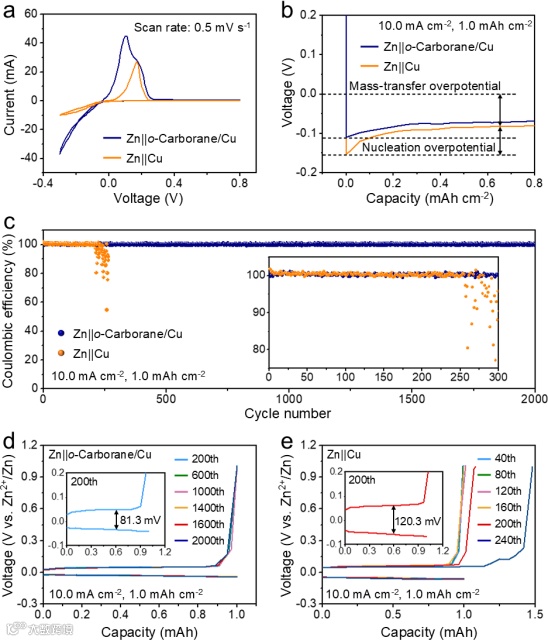近日,南京大学金钟教授团队提出了一种创新性解决方案,通过在锌金属表面自发构建一种由笼状邻碳硼烷(o-carborane)簇构成的人工界面层,有效解决了上述难题。该工作的核心观点是利用具有独特笼状结构的邻碳硼烷分子,通过简单的溶液浸泡法,借助静电吸附作用使其自发、均匀地锚定在锌金属表面,形成一层稳定且致密的人工保护层。该邻碳硼烷界面层展现出卓越的结构稳定性、化学惰性和疏水性,能够同时发挥多重关键作用:1. 屏蔽腐蚀与副反应:有效阻隔水分子对锌负极的侵蚀,显著抑制析氢反应和锌腐蚀。2. 引导均匀沉积:重新分布锌离子流,消除“尖端效应”,促进锌的均匀成核与无枝晶沉积。3. 加速离子传输:构建了高锌离子电导率的界面环境,提升了电极反应动力学。得益于这一精心设计的人工界面,改性后的锌负极在对称电池和锌铜半电池中均表现出超长的循环寿命和优异的可逆性,即使在高电流密度下也能稳定运行。当与V2O5正极组装成全电池时,其展现出低电压极化、优异的倍率性能和超过3000次的稳定循环。这项工作为通过特定分子簇设计高性能人工界面层,以稳定金属负极、开发高效安全的水系多价离子电池提供了新的思路。该成果以“Self-Absorbed Cage-like o‑Carborane Atomic Cluster Derived Artificial Interphase for Aqueous Zinc-Ion Batteries”为题发表在 “ACS Energy Letters” 期刊,南京大学副研究员冯雨歌(现任职东南大学工程师)和南京大学博士研究生王耀达为论文的共同第一作者。