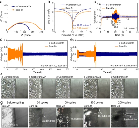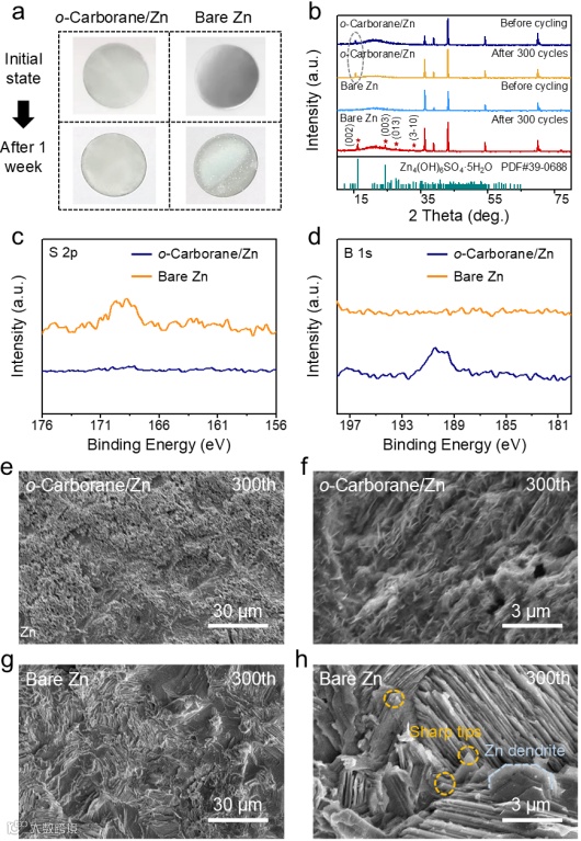 图三通过一系列浸泡实验与循环后表征,证实了邻碳硼烷界面层卓越的化学稳定性与长效保护能力。 将改性电极与裸锌电极直接在电解液中浸泡一周后,改性电极表面依然完好,而裸锌电极已严重腐蚀失去金属光泽,直观展现了其出色的抗腐蚀性能。循环后的XRD图谱显示,改性电极表面未检测到副产物特征峰,而裸锌电极则生成了大量碱式硫酸锌等腐蚀产物。XPS分析进一步表明,循环后改性电极表面仍能清晰检测到邻碳硼烷的特征信号,同时有效抑制了电解液分解产生的含硫物种。SEM图像更显示,经过300次循环后,改性电极表面依然均匀致密,完全避免了裸锌电极上出现的尖锐枝晶与粗糙形貌。