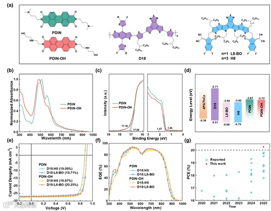 图1.(a) PDIN、PDIN-OH、D18和H8的分子结构。(b) PDIN和PDIN-OH薄膜的紫外吸收光谱。(c) PDIN和PDIN-OH的UPS光谱。(d) 材料的能级图。(e)器件的J-V曲线。(f) 器件的EQE曲线。(g) 文献对比图。
