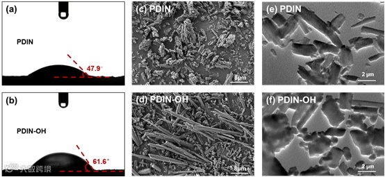 图2.(a)PDIN的接触角。(b)PDIN-OH的接触角。(c)PDIN的SEM图。(d)PDIN-OH的SEM图。(e)PDIN的TEM图。(f)PDIN-OH的TEM图。