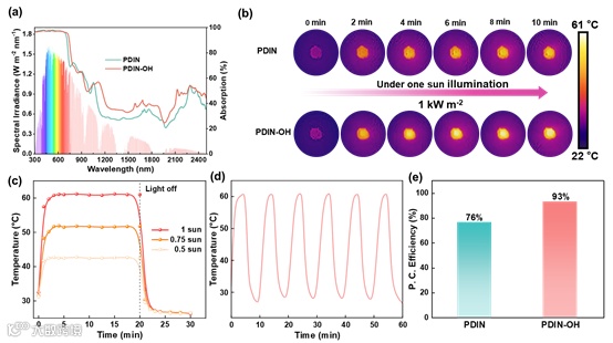 图3.(a)PDIN和PDIN-OH的紫外-可见-近红外吸收光谱。(b)PDIN和PDIN-OH的红外热像。(c)PDIN-OH在不同太阳辐照下的光热转换行为。(d)PDIN-OH在五个加热-冷却循环中的抗光漂白性能。(e)PDIN-OH和PDIN的光热转换效率。