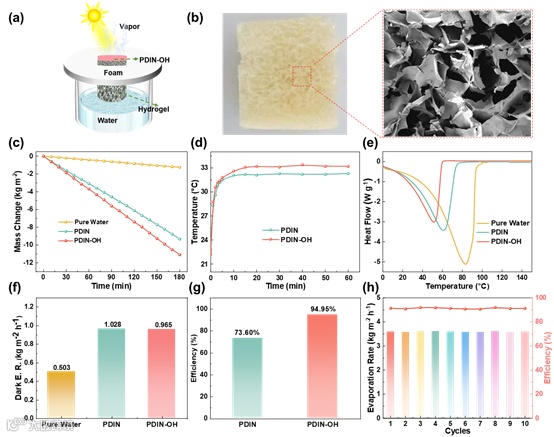 图4.(a)太阳能蒸发器装置示意图。(b)水凝胶图像和SEM图像。(c)标准辐照(1kW m-2)下蒸发器内水的质量变化。(d)蒸发器一小时内表面温度曲线。(e)水的蒸发焓曲线。(f)蒸发器在黑暗下的蒸发速率。(g)蒸发器在标准辐照下的光蒸发效率。(h)PDIN-OH在10小时内太阳能淡化3.5%盐水的蒸发速率和效率。