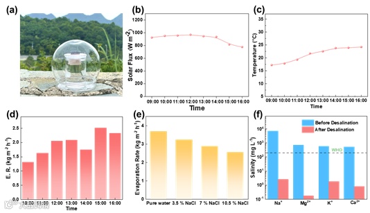 图5.(a)室外蒸发器设置示意图。(b)上午9:00至下午4:00太阳光照强度的变化。(c)上午9:00至下午4:00环境温度的变化。(d)蒸发器室外部分上午9:00至下午4:00蒸发速率的变化。(e)不同盐浓度下蒸发器的蒸发速率。(f)净化前后模拟海水样品中四种离子(Na+、Mg2+、K+、Ca2+)浓度的变化。