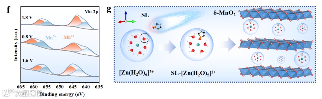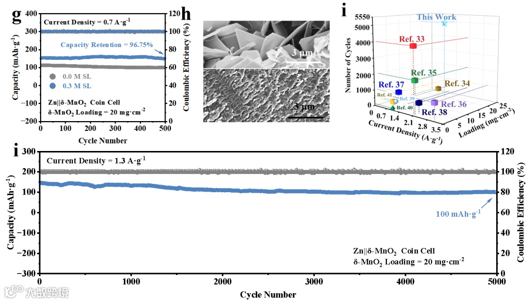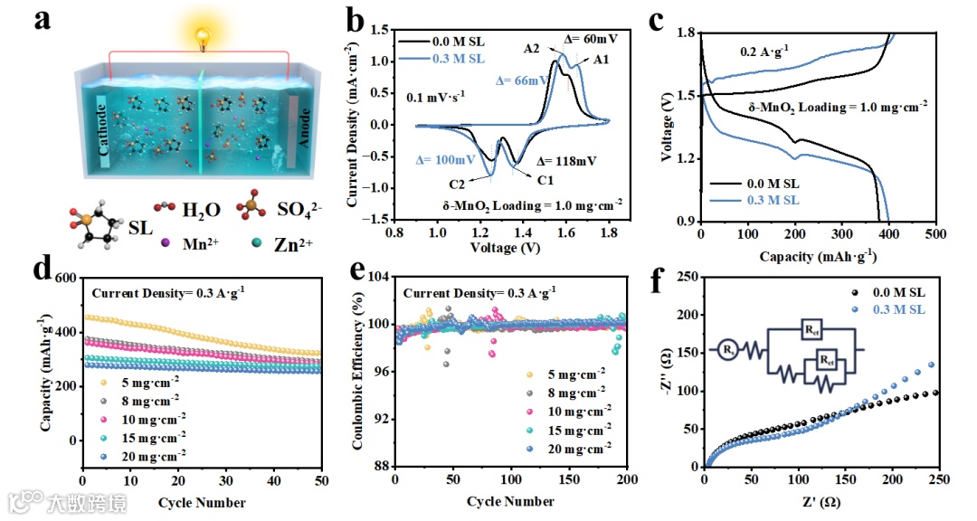 “溶剂化–界面–晶格”三重协同调控:利用SL与Zn²⁺的强配位能力,构筑SL-[Zn(H₂O)₅]²⁺溶剂化结构,降低Zn²⁺去溶剂化能垒;其疏水环构建界面屏障抑制锌枝晶和副反应,亲水–SO₂–基团提升润湿性并均匀电场,同时在δ-MnO₂正极侧作为协同嵌入缓冲层,缓解晶格应变和Jahn–Teller失稳,从而在高载量下协同稳定正负极。 -