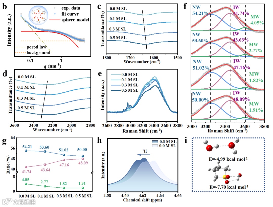 SL具有优异热稳定性和强极性,其较高偶极矩和介电常数赋予其与H₂O更强氢键作用,从热力学角度看,SL的高偶极矩(μ= 5.4 D)和强极性使其与水分子间的结合能(–0.27 eV)较水-水结合能(–0.23 eV)提升17%,这驱动了BHNs的自组装形成。光谱分析进一步揭示其动力学调控机制:ATR-FTIR中O–H振动的频移及拉曼光谱中O–H伸缩强度减弱,均说明SL增强了氢键相互作用,削弱了O–H共价特性。¹H NMR显示H₂O质子信号上移约0.02 ppm,反映水分子在BHNs中迁移受限。定量氢键能分析表明,SL中–SO₂–基团与水形成的氢键(–7.70 kcal·mol⁻¹)较H₂O–H₂O键(–4.99 kcal·mol⁻¹)强度提升54%,进一步稳定了局部水结构,最终通过“反应物饥饿”效应在电极界面抑制质子还原,从而降低水活性和质子还原动力学,提升电池稳定性。