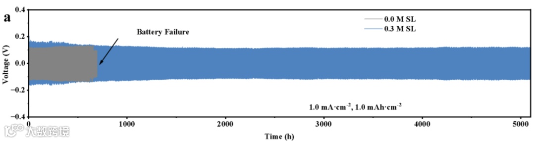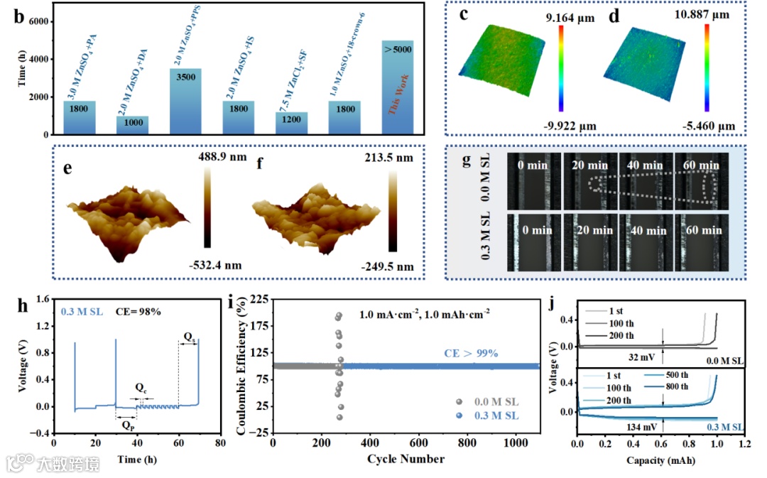 BHNs结构通过独特的“溶剂化脱水-界面隔离-晶面取向控制”级联机制实现多重优化:SL的疏水环向外形成物理屏障,将电极接触角从107.5°降至93.6°,增强润湿性;亲水–SO₂–基定向吸附界面,使双电层电容从5.9 μF·cm⁻²降至1.2 μF·cm⁻²,有效均匀化离子通量。该系统同步抑制了Zn₄SO₄(OH)₆·xH₂O等副产物生成,使锌沉积高度差降低57%,实现平整无枝晶沉积形貌。电化学性能方面,Zn||Cu半电池在1000次循环中保持99%的高库仑效率,极化电压从134 mV显著降低至32 mV,证实其卓越的界面稳定性与沉积可逆性。