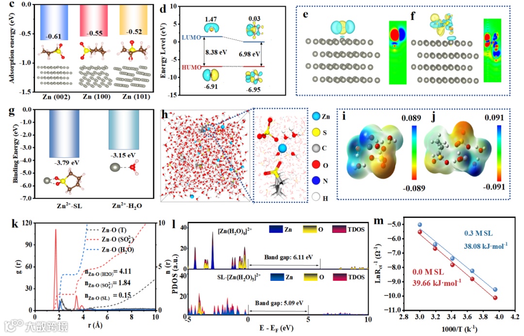通过引入0.3 M SL,电解液在锌(002)晶面表现出显著择优取向,其关键机制源于SL分子与锌表面之间0.38 eV的强吸附能(优于H₂O的0.16 eV),以及其较小的HOMO–LUMO能隙(6.98 eV),有效促进界面电子传输。同时,SL中SO₂基团与Zn²⁺的结合能达3.79 eV,优于Zn²⁺H₂O(3.15 eV),使其竞争进入Zn²⁺溶剂化壳层,将水分子配位数从5.0降至4.1,显著抑制水相关副反应。实验结果显示,该BHNs结构使腐蚀电流密度从3.86 A·cm⁻²大幅降至28.13 μA·cm⁻²,HER起始电位负移182 mV,证实其有效抑制析氢与腐蚀。此外,Zn²⁺迁移数提升至0.81,为基准体系(0.28)的2.9倍,Zn²⁺脱溶剂化能垒由39.66 kJ·mol⁻¹降至38.08 kJ·mol⁻¹。