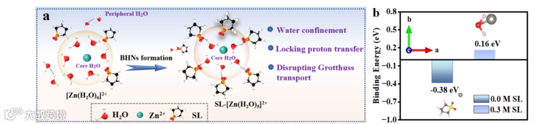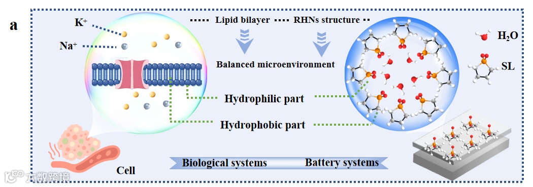 仿生水合纳米结构电解液设计:借鉴细胞膜磷脂两亲性结构,引入两亲性砜烷(SL),在水系ZnSO₄电解液中自组装形成仿生水合纳米结构,同时重构水的氢键网络、限制Grotthuss质子传导并降低水活性,实现对电解液微环境的精细调控。 -