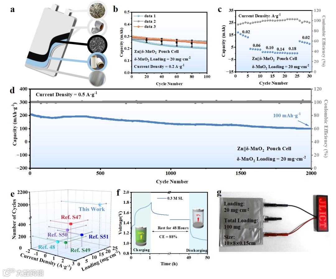 图6. 高负载量Zn||δ-MnO2软包电池的验证