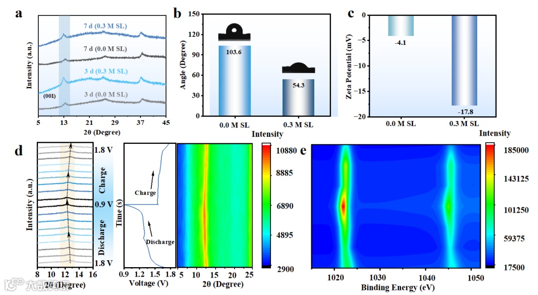 在正极侧,BHNs结构通过疏水骨架构建空间屏障阻隔H⁺/H₂O侵蚀,同时亲水-SO₂-基团定向吸附使电极接触角从103.6°显著降至54.3°,大幅提升润湿性并形成静电屏蔽与配位竞争双重保护机制,有效抑制锰溶解与结构退化。原位XRD证实(001)晶面在12.6°-12.3°实现完全可逆变化,结合准原位XPS验证的Zn²⁺可逆插层行为,揭示了BHNs出色的晶格应力缓冲能力。HR-TEM显示BHNs组保持完整晶格结构,而深度XPS检测到11.64%的硫元素均匀分布至亚表面,证实SL深度参与溶剂化重构。这种“空间阻隔-界面修饰-溶剂化调控”三重协同机制,为高负载锌离子电池提供了创新解决方案。