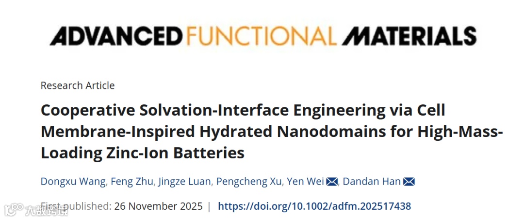 该工作于2025年11月26日,以题为“Cooperative Solvation-Interface Engineering via Cell Membrane-Inspired Hydrated Nanodomains for High-Mass-Loading Zinc-Ion Batteries”在国际知名期刊Advanced Functional Materials上发表。第一作者是吉林化工大学硕士研究生王冬旭,清华大学危岩教授为论文的共同通讯。