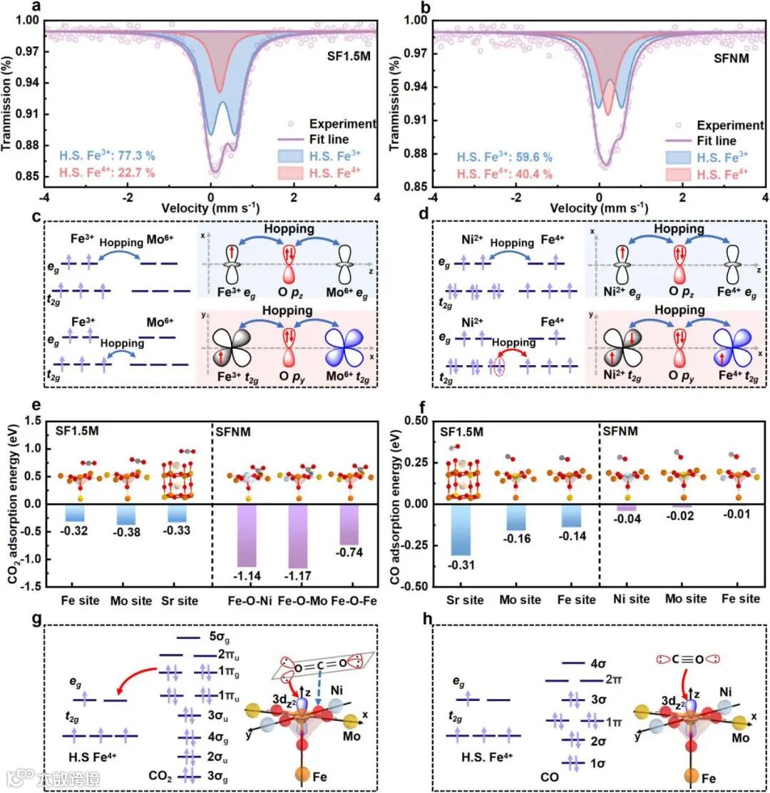 57Fe穆斯堡尔谱能够准确地确定了Fe的自旋态。如图5 a所示,单重态(singlet)表示高自旋Fe4+,其含量为22.7%,而双重态(doublet)表示高自旋Fe3+,其含量可能达到77.3%。如图5 b所示,Fe4+的含量显著增加至40.4%,而Fe3+的含量下降至59.6%。这一发现与XANES和XPS的结果一致,基于穆斯堡尔谱信息,本文深入研究了B位金属组分的d轨道相互作用。如图5c所示,SF1.5M的Fe3+和Mo6+的d轨道分为两组,eg和t2g(图5c左)。Fe-O-Mo可以通过eg-pz-eg轨道链形成电子跳跃,因为相邻的Fe和Mo由桥联氧原子连接,并且它们的eg轨道与氧的pz轨道的对称性匹配(图5c右上)。根据洪特法则,由于每个轨道所能容纳的电子是一对自旋相反的电子,当这些轨道中存在电子空位时,就产生了电子跳跃的可能性。
