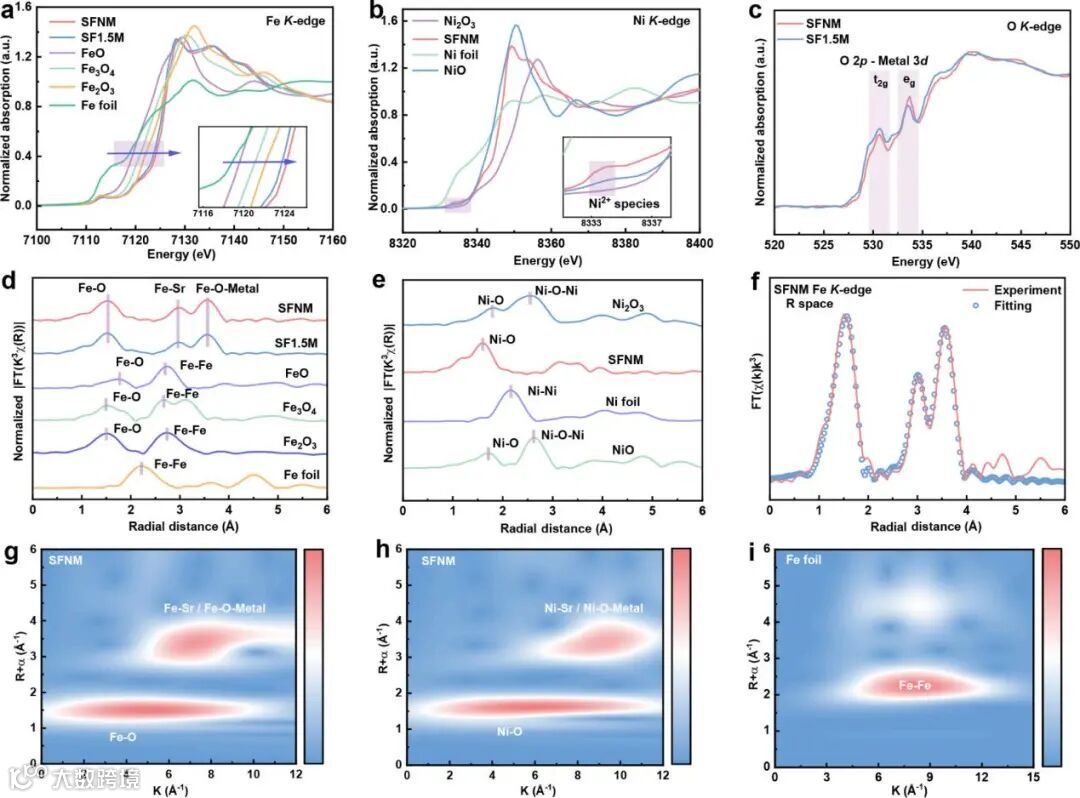 使用K边XANES光谱研究了SFNM和SF1.5M中Fe的电子态(图4a)。在归一化吸收强度约为0.4-0.5的区域(图4a的插图),可以观察到SFNM和SF1.5 M的Fe离子的平均化合价高于+3。SFNM和SF1.5M都显示出一定量的Fe4+。在Ni相关物种的XANES中(图4b),SFNM在8333 eV左右显示出比Ni−O六配位氧化物NiO更高的边缘峰强度。因此,可以得出结论,SFNM中的大多数Ni2+ 离子是配位饱和的,而一小部分Ni-O键被破坏以产生配位不饱和的Ni-O四面体。由于氧空位的增加,SFNM中少数配位不饱和的高自旋Ni2+(t2g6eg2)离子发生自旋跃迁至低自旋Ni3+(t2g6eg1),不饱和的低自旋Ni3+也可以提供占有率为1的部分占据的eg轨道。O K边XANES光谱中的紫色区域对应于O 1s→O 2p-金属3d的激发(从O 1s态到杂化O 2p-金属3d态的激发)。Ni掺杂后,对应于t2g轨道的峰强度降低,而与eg相关的峰强度增加,表明t2g轨道中的电子占据增强,B位离子的eg电子密度降低。t2g电子数量的增加归因于Ni2+ 掺杂:Ni本身在其t2g轨道中至少有五个电子,明显多于SF1.5M中的Fe离子(Fe3+/Fe4+在t2g轨道中有三个电子)和Mo离子(Mo5+具有一个t2g电子和Mo6+具有空的t2g轨道)。eg电子的减少来自Fe离子的自旋跃迁。尽管掺杂的Ni2+贡献了两个eg电子,但Fe离子在Ni掺杂期间经历自旋跃迁,形成更多的Fe4+,eg轨道占有率为1。与SF1.5M相比,eg电子密度整体降低,为我们的自旋调控策略提供了实验证据。