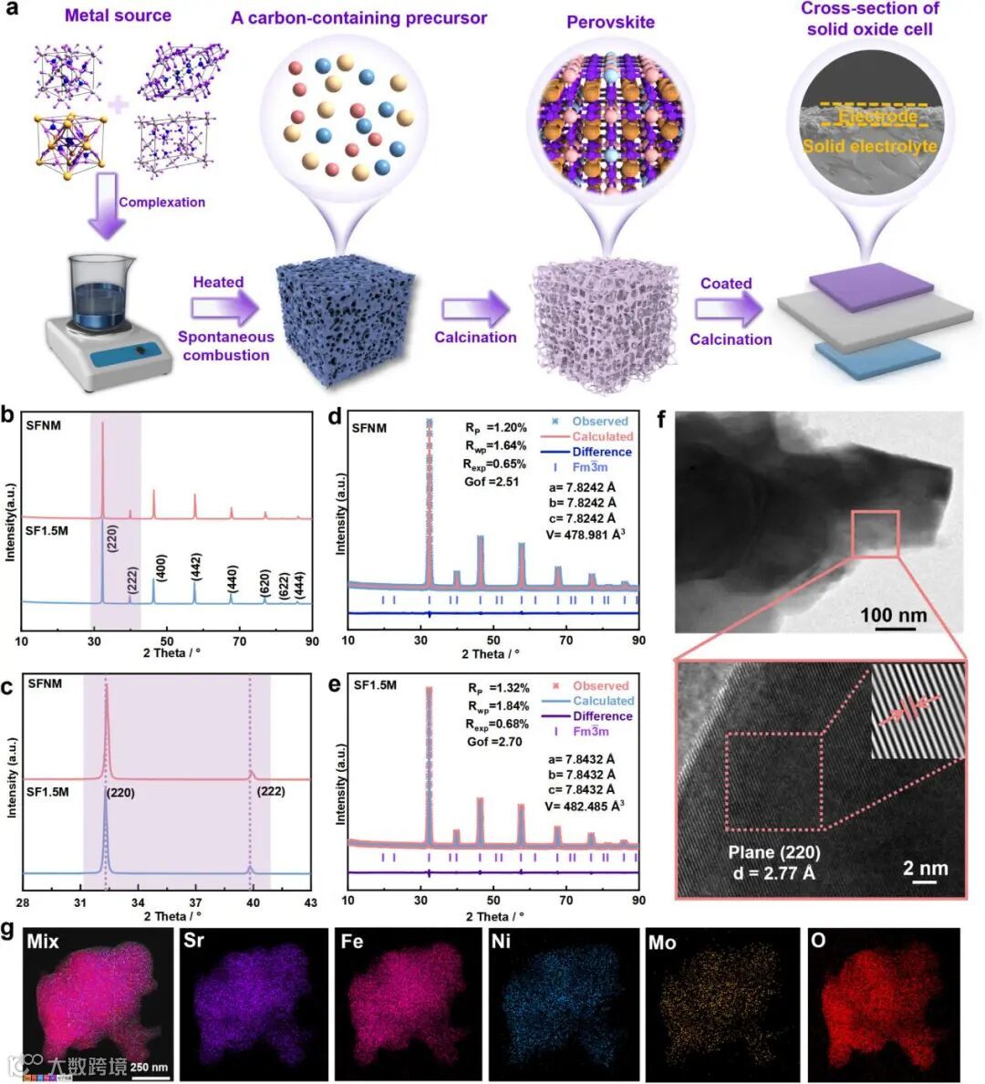 图1展示了SFNM和SF1.5M氧化物的合成与结构表征,利用XRD和HR-TEM证实了SFNM和SF1.5M的合成。Rietveld精修也证实了Ni引入后晶胞体积的略微畸变,EDS也显示出均匀分布的各元素。