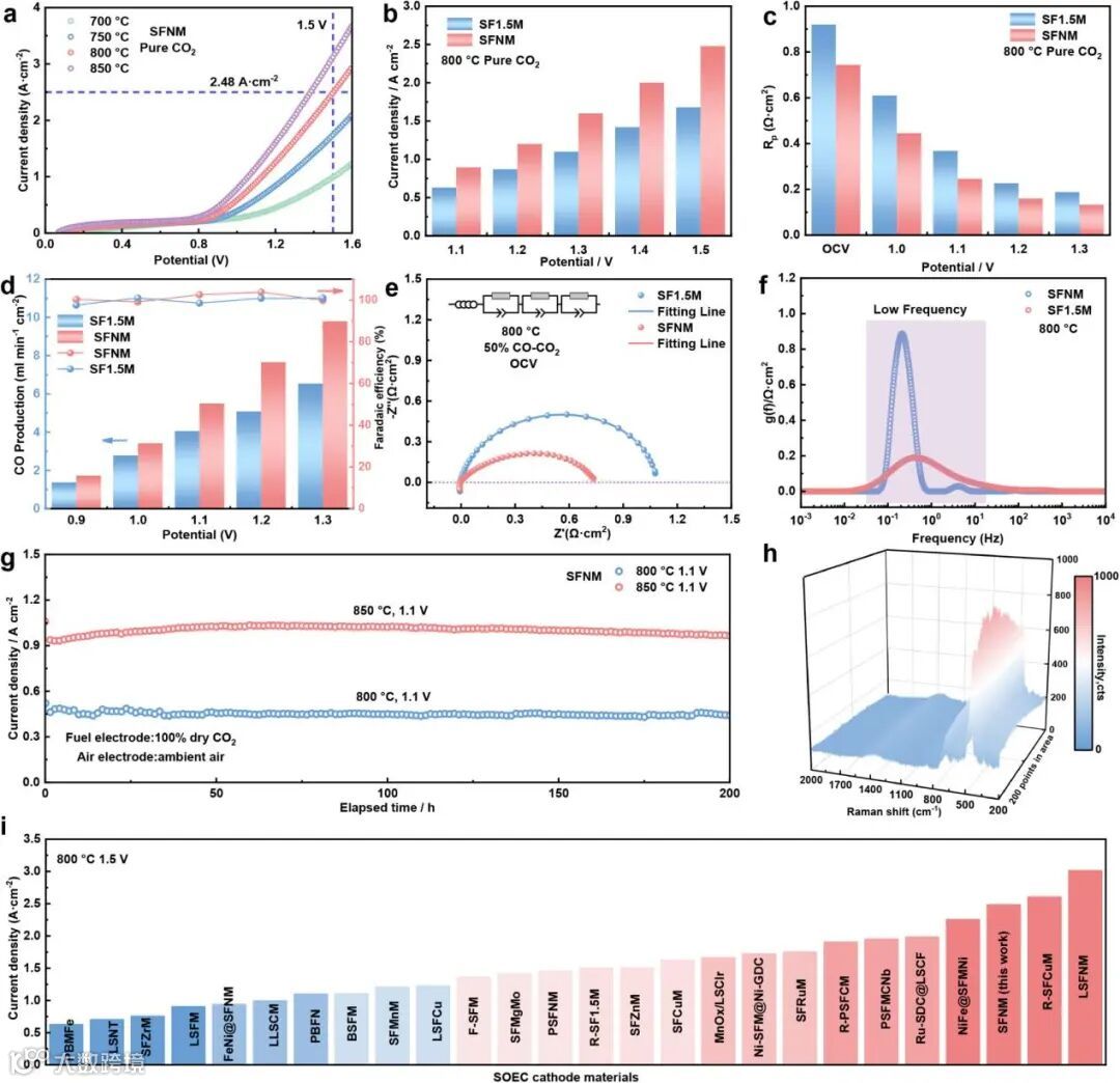 在800°C和1.1、1.2、1.3、1.4和1.5 V的施加电位下,SFNM阴极的电解电流密度约为0.87、1.20、1.61、2.02和2.48 A cm-2(图3a),比使用基于SF1.5M的阴极的单电池高出约50%。SFNM单电池对应的极化阻抗也小于SF1.5 M单电池。SFNM在电化学测试中也表现出优异的长期稳定性。SFNM阴极在800℃和850℃下在1.1 V下200小时内没有显示出显著的衰变。