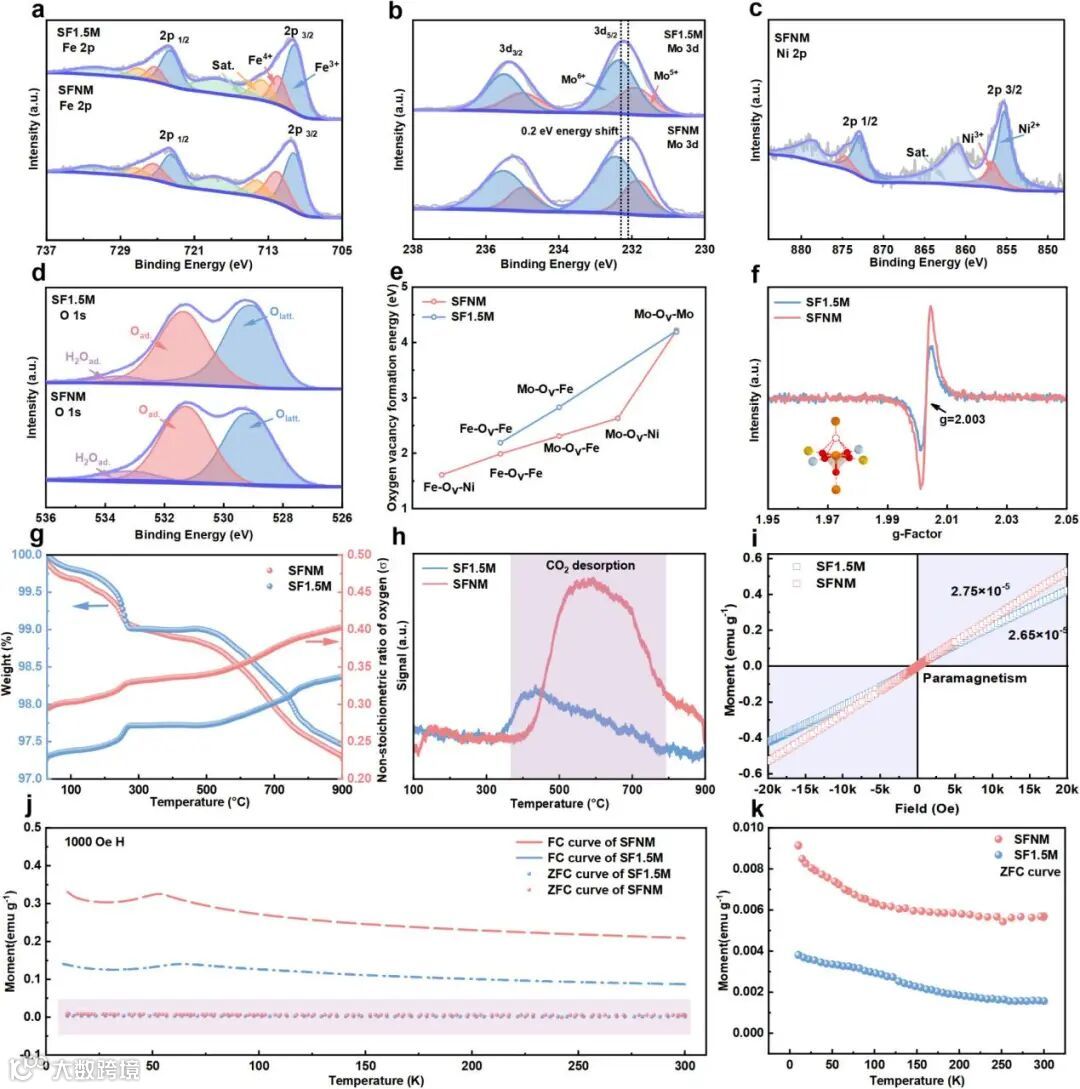 XPS表明Ni引入后,表面吸附氧物种增多,SFNM的Fe4+含量增加,表明Ni掺杂显著改变了Fe的氧化态。结合DFT氧空位形成能计算以及EPR测试、TG测试,证实Ni的引入改善了SFNM内氧空位浓度。这表明金属离子配位环境的变化和氧空位浓度的增加可以显著增强CO2的吸附。CO2-TPD实验表明,SF1.5M中大规模CO2解吸附的温度约为480℃,而在SFNM中,温度升高至600℃左右。这表明Ni掺杂增强了CO2的吸附。在磁滞回线测试和温度依赖磁化曲线中,SFNM在零场冷却(ZFC)和场冷却(FC,施加磁场强度H=1000 Oe)曲线上都表现出更高的质量磁化率。SFNM和SF1.5M的FC曲线分别在52 K和61 K表现出拐点,这通常被称为Néel温度,表明材料从顺磁态到反铁磁态的转变。基于上述分析,认为SFNM中增强的不成对电子源于其升高的氧空位浓度。