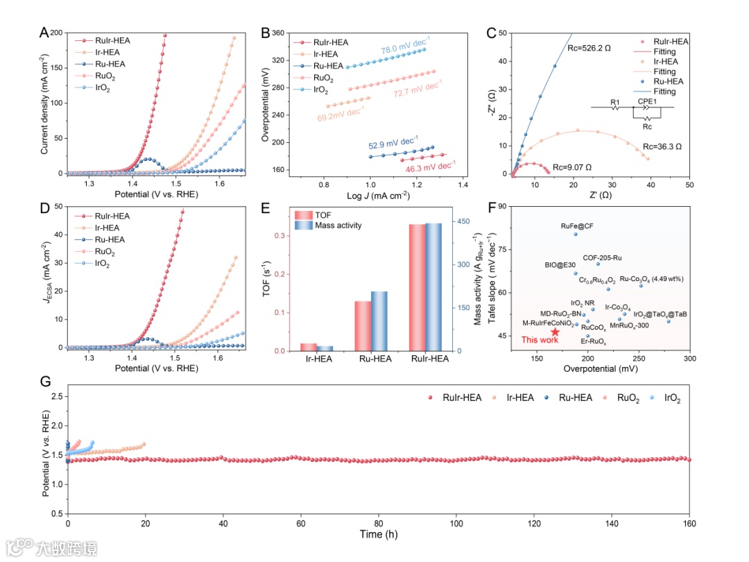 制备的RuIr-HEA在0.5 M H2SO4溶液中表现出优异的OER催化性能。在10 mA cm-2电流密度下过电位仅为168 mV,显著优于Ru-HEA(179 mV)、Ir-HEA(266 mV)及商业RuO2(284 mV)和IrO2(317 mV)。同时,Ir元素的引入能够显著降低金属Ru的溶解率,进而提升其在酸性OER过程中的耐久性。