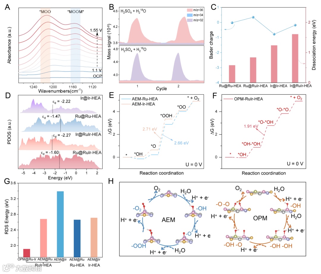 原位光谱和DFT分析表明,在Ru-HEA中加入较大原子半径的Ir元素会形成牢固的Ru-Ir键并产生压缩应变,进而推动了OER反应路径从传统的吸附演化机制转变为直接氧耦合路径机制,有效促进了氧中间体的直接耦合。此外,压缩应变还增强了原子间的相互作用,提高了催化稳定性。这一发现为在实际PEMWE应用中克服催化剂活性与稳定性平衡问题提供了有效的参考方法。