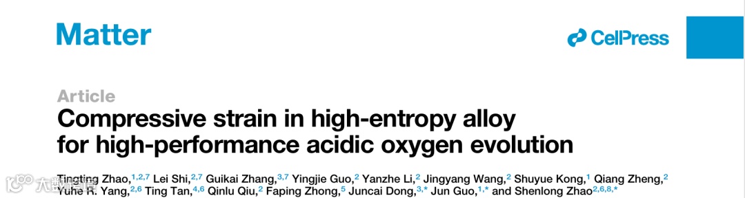 基于此,国家纳米科学中心赵慎龙教授与天津工业大学郭俊教授、中国科学院高能物理研究所董俊才教授在国际知名期刊Matter上发表题为“Compressive strain in high-entropy alloy for high-performance acidic oxygen evolution”的研究性文章。该文章通过在高熵合金中引入压缩应变效应实现了酸性析氧反应活性与稳定性的平衡制约问题。