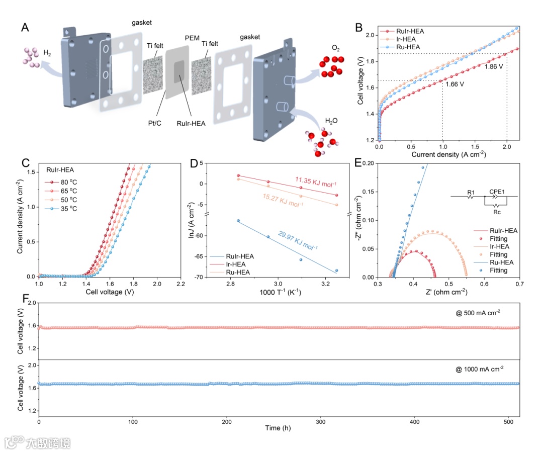 制备的RuIr-HEA作为阳极催化剂在PEMWE电解槽中可实现11.35 kJ mol−1的低水分解活化能,在2.0 A cm−2的电解电流密度下电压低至1.86 V,并在500和1000 mA cm−2电流密度下保持500小时以上的优异稳定性。