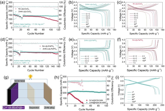 在与LiCoO2和LiFePO4组装的贫锂全电池(N/P= ~2)中,ZnNi-Li均展现出良好倍率性能和循环性能。最后,通过结合Li3N正极预锂化策略,采用高镍正极LiNi0.94Co0.03Mn0.03O2和ZnNi@Ni集流体组装的AFLMB能够在100圈循环后实现89.6%的容量保持率,能量密度超过400 Wh kg-1。