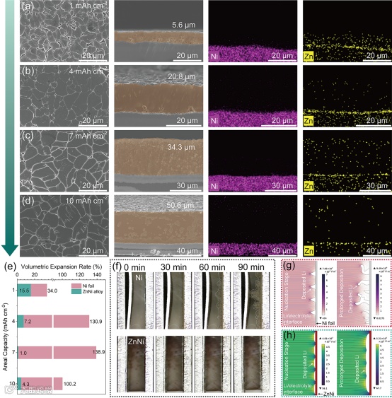 通过表面及截面的SEM及EDS表征,确认了ZnNi表面的金属锂具有致密的,无枝晶的沉积形貌,同时确认了ZnNi合金的结构稳定性。原位的光学显微镜表征在宏观层面进一步确认了ZnNi表面的金属锂具有致密均匀的沉积过程,归因于ZnNi良好的亲锂性。有限元模拟结果表明,由于ZnNi合金表面的金属锂呈现团状沉积,避免了尖端效应的发生,从而抑制了锂枝晶的生长。