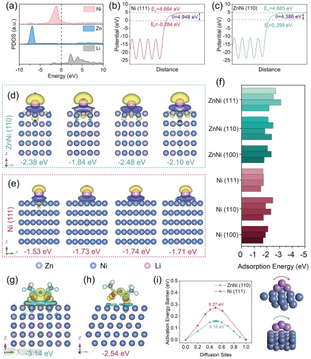 DFT计算结果表明,ZnNi表面具有低功函数,高锂离子吸附性的特性,说明了ZnNi合金具有高亲锂性的内在原因。同时,计算结果也表明ZnNi对TFSI-阴离子具有强吸附性,这有利于促进ZnNi表面生成富含LiF的SEI的生成。此外,ZnNi表面的锂原子的迁移能垒也较低,这有利于促进锂的均匀分布,抑制枝晶生长。