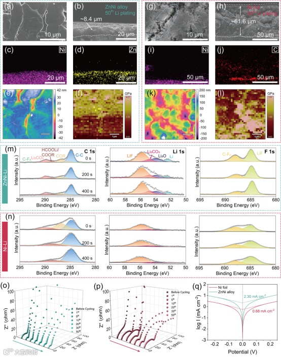 在50圈循环后,ZnNi表面的金属锂仍然具有致密平坦的结构,且亲锂层保持结构稳定。AFM表征确认了ZnNi上的沉积锂表面具有低粗糙度及高杨氏模量的特性。XPS表征证明了SEI层中具有更高的LiF含量,与DFT计算结果相对应。这样的SEI降低了电池阻抗,提高了电极表面的交换电流密度。