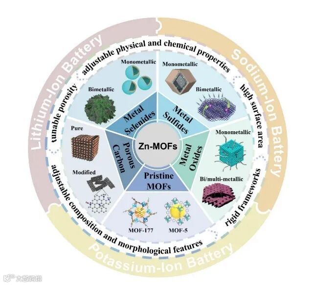 在众多MOFs中,锌基MOF(Zn-MOFs)因其优异的物理化学特性、低成本和高稳定性备受关注。Zn-MOFs及其衍生物(如多孔碳、金属氧化物、硫化物和硒化物)在AIBs中展现出广阔的应用前景。本文综述了Zn-MOFs及其衍生物的合成策略、应用进展以及未来发展方向,为相关领域的研究提供了重要参考。