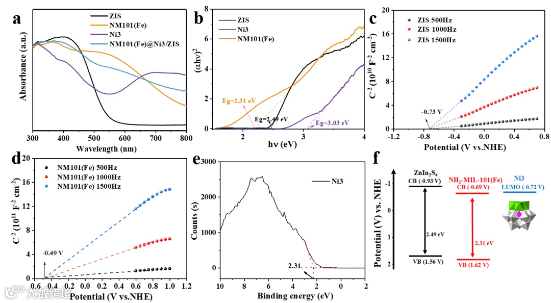图3. (a) ZIS, NM101(Fe), Ni3, 以及NM101(Fe)@Ni3/ZIS的紫外可见DRS图 (b) ZIS, NM101(Fe), 以及Ni3POM的Tauc图 (c, d) ZIS以及NM101(Fe)的莫特肖特基测试 (e) Ni3POM的XPS 价带谱 (f) ZIS, NM101(Fe), 以及Ni3POM的带隙位置示意图